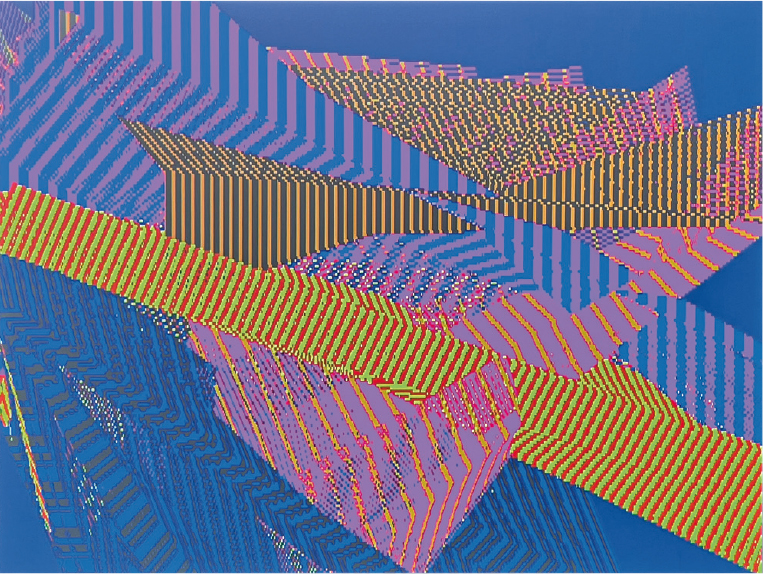 而第二個作品,則是整個展覽的點題作,藝術家薩米亞.哈拉比(Samia Halaby)的Fold 2。這件1988年的作品大概是最早使用家用電腦以及程式編碼來創作的繪畫作品之一,藝術家利用一部Amiga 1000家用電腦,配合C以及Visual Basic的編碼來創作出一段幾何風格的動畫。以現在的標準來看它或者不是什麼驚天動地的作品,但是它卻象徵着數碼藝術的普及化,以及當代美學的延伸。