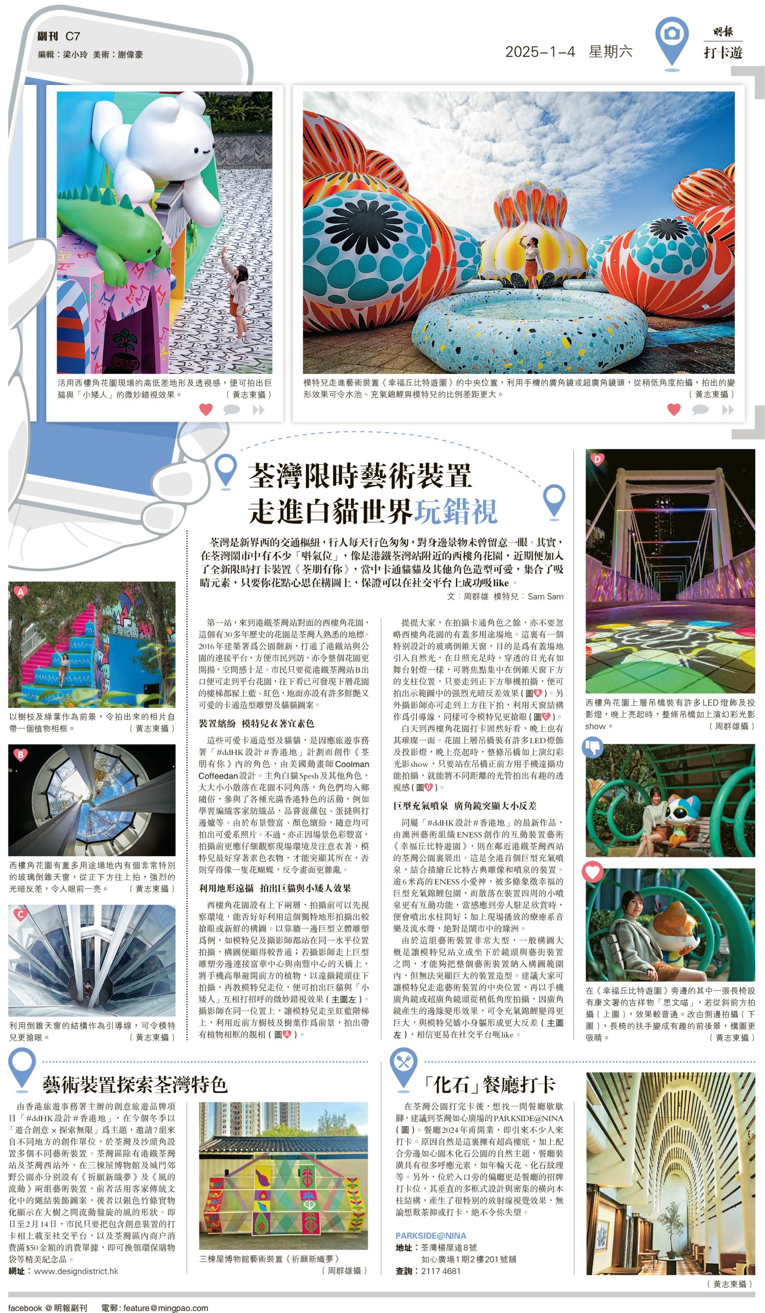 【明報專訊】荃灣是新界西的交通樞紐,行人每天行色匆匆,對身邊景物未曾留意一眼。其實,在荃灣鬧市中有不少「唞氣位」,像是港鐵荃灣站附近的西樓角花園,近期便加入了全新限時打卡裝置《荃朋有你》,當中卡通貓貓及其他角色造型可愛,集合了吸睛元素,只要你花點心思在構圖上,保證可以在社交平台上成功吸like。