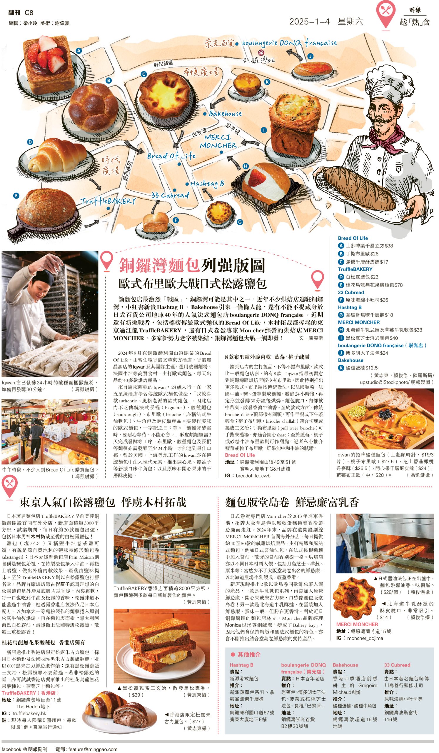 【明報專訊】論麵包店最激烈「戰區」,銅鑼灣可能是其中之一。近年不少烘焙店進駐銅鑼灣,小紅書新貴Hashtag B、Bakehouse引來一條條人龍,還有不能不提藏身於日式百貨公司地庫40年的人氣法式麵包店boulangerie DONQ française。近期還有新挑戰者,包括標榜傳統歐式麵包的Bread Of Life,木村拓哉都捧場的東京過江龍TruffleBAKERY,還有日式卷蛋專家Mon cher經營的烘焙店MERCI MONCHER。多家新勢力老字號集結,銅鑼灣麵包大戰一觸即發!