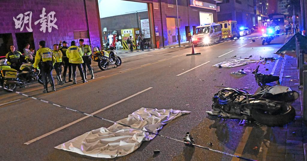 九龍灣今午(3日)發生的奪命車禍。死者女友及一齊騎電單車的朋友聞訊趕到現場,女友傷心飲泣。死者朋友Roy表示,出事前兩人在附近吃飯,飯後分別騎電單車在附近兜風時,有交通鐵馬亮藍燈,疑似截住朋友。Roy說,該名交通警當時的指示不清晰,沒有開咪廣播,不知是否要求朋友停車或讓路,也不清楚朋友是否有意躲避警方鐵馬。