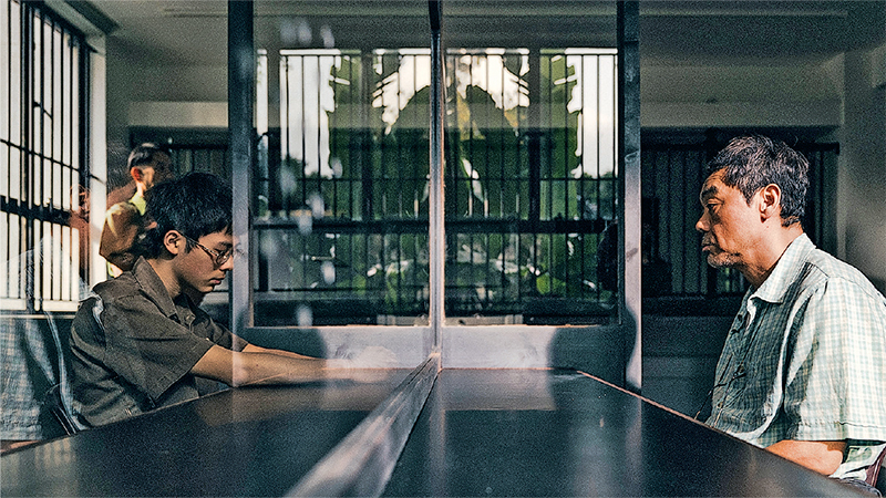 永年本人也有幻覺的。我們代入他的視角,一個人呆在家時,常以為女兒仍在身旁。順帶一提,女孩演員熊諾頤後面擁抱爸爸,叮囑他好好過日子好動人。或許翁子光的《爸爸》旨在叫我們想想自己與精神錯亂、倫常慘案的咫尺距離吧。阮厚明牢獄中過18歲生辰,父親阮永年去探望他一幕,中間的鏡子反映出硬幣的兩面(想起是枝裕和的《第三度殺人》),父子的身影剛好對疊一起了。