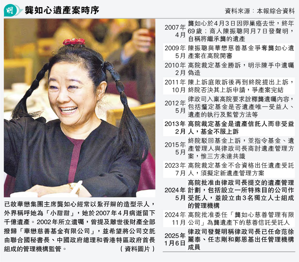 【明報專訊】龔如心遺產官司自2009年開審,至今歷15年續有發展。外界一直關心其遺產金額,龔去世後數年金額一直成疑,直至律政司介入要求法庭詮釋其遺囑內容,遺產數目在庭上首度披露,當時約值820億至830億元。法庭在2022年頒下的判詞辭則提到,龔的主要資產為華懋集團股權,相關股權至2020年底約值1410億元。