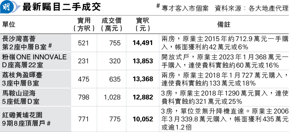 其他二手方面,部分屋苑今年首開齋即「見紅」。美聯高級營業經理丘志權表示,馬鞍山迎海5座低層D室,實用面積798方呎,3房1套連工人套間隔,向西南享海景,以1028萬元易手,實呎約12,882元。買家為同區客,買入單位予父母居住。原業主2018年1290萬元買入,持貨近7年,帳面蝕262萬元或20%,連使費料實蝕約320.7萬元或25%。