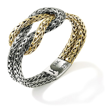 【明報專訊】黃金代表豐足滿盈,尤其在新春打扮中甚受歡迎。經常以銀色和黑色型格示人的John Hardy,最近也為其Love Knot系列加入14K金的新款設計。系列以錯綜複雜的手工編織鏈,繫成標誌的雙繩結形態,象徵承諾、堅韌和愛,最新款式引入雙色調風格,融合純銀和14K金,包括耳環、雙圈推扣式手鐲和戒指,總有一款適合摰愛親友。Spear系列同樣加入14K金物料,橢圓造型讓飾品自然地環繞頸部、手腕和手指,提升佩戴舒適度。●