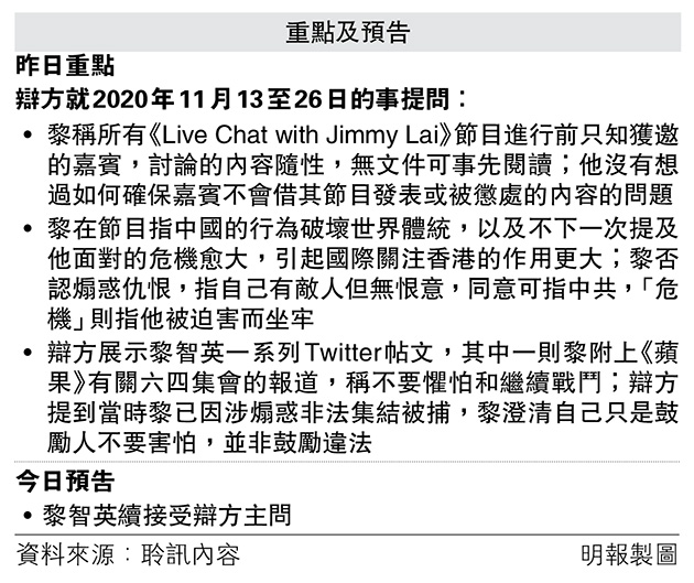 辯方播放2020年11月13日《Live Chat》節目及展示相關謄本,當日的嘉賓為前港督彭定康,黎指言論、宗教等自由猶如氧氣,也是為何港人意識到自由和法治被剝奪時會上街抗爭,亦應繼續為此抗爭,但《國安法》實施後已無空間這樣做。黎供稱所指的「抗爭」只是一個比喻,正如某人肚餓,也會「爭取」(fight for)一頓飯,否認煽動他人上街,一向反對任何形式暴力。
