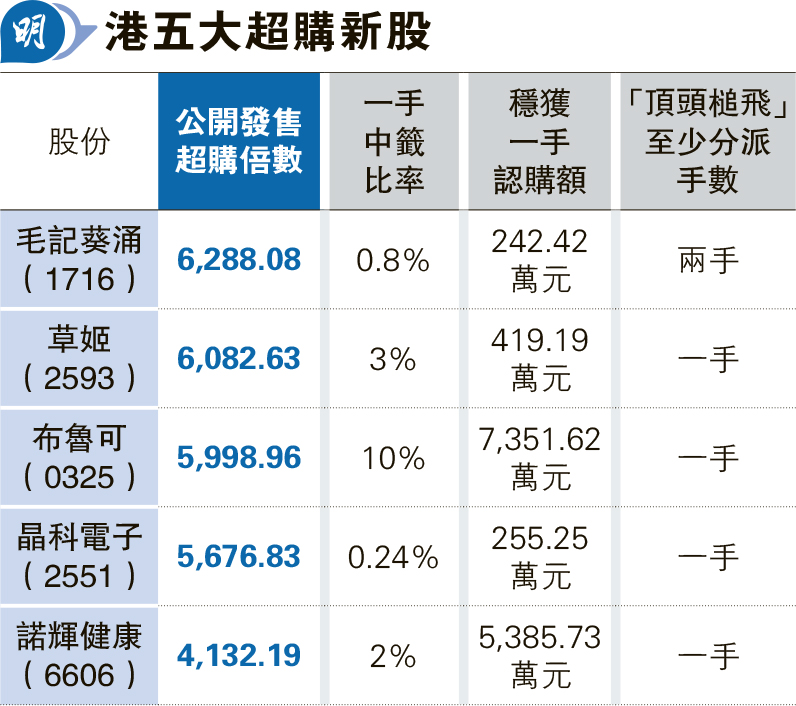 【明報專訊】熱爆新股拼搭玩具品牌布魯可(0325)公開發售部分最終獲超購5998倍,雖略少於早前孖展統計的6034倍,但仍穩居本港新股市場歷來第三大「超購王」寶座(見表)。大額超購下,集團即使悉數行使發售量調整權再加碼增發15%股份,令總集資額增至16.74億元,但仍「一手難求」,投資者要斥資7350萬元認購「頂頭槌飛」才穩獲一手。