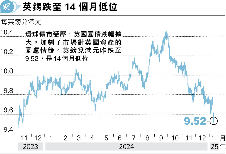 【明報專訊】市場押注美聯儲較長時間維持較高利率,令美元持續強勢,美國國債以至環球債市受壓,衝擊英國債匯市場。英國10年期國債孳息率昨曾升至4.925厘,是2008年以來高位。英國30年期國債孳息率亦升穿5.45厘,連續3天刷新1998年以來最高水平。英鎊兌美元昨亦跌至1.2239,兌港元失守9.6算,是2023年11月以來低位。