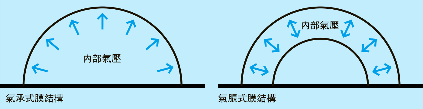 氣承式膜結構(Air supported Membrane Structure):透過內部氣壓支撐薄膜,形成大型覆蓋空間,常見於臨時展覽或體育館。