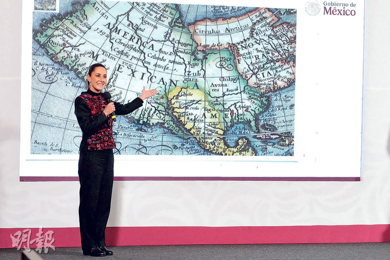 此外,對於特朗普周二表示,美國要將墨西哥灣改名為「美國灣」,墨西哥總統欣鮑姆(Claudia Sheinbaum)周三(8日)反擊,提出將包括美國在內的北美洲改名「墨西哥美洲」(Mexican America)。欣鮑姆在記者會上展示一幅17世紀地圖,顯示北美洲被稱為「墨西哥美洲」,她指着地圖笑說:「墨西哥美洲,聽起來不錯。」陪同欣鮑姆出席記者會的文化部長雷亞爾補充,「墨西哥灣」這個名字得到國際認可,且作為海上航行參考使用了數百年。