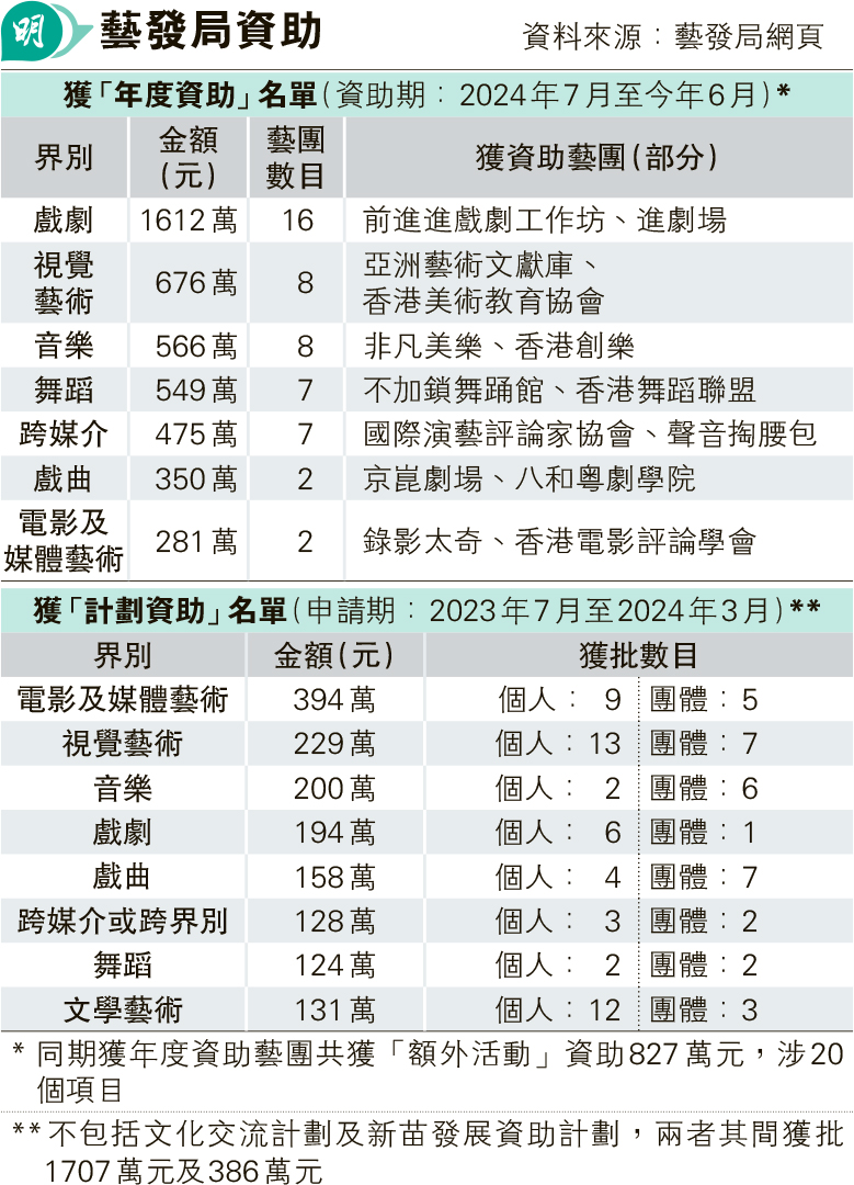 根據藝發局網頁,去年7月至今年6月的年度,音樂、舞蹈、視覺藝術、跨媒介等7個藝術界別的年度資助,每個界別各獲介乎約281萬至1612萬元,獲資助藝團介乎2至16個;各藝團獲批介乎30萬至200萬元,即平均每月2.5萬至16萬多元。