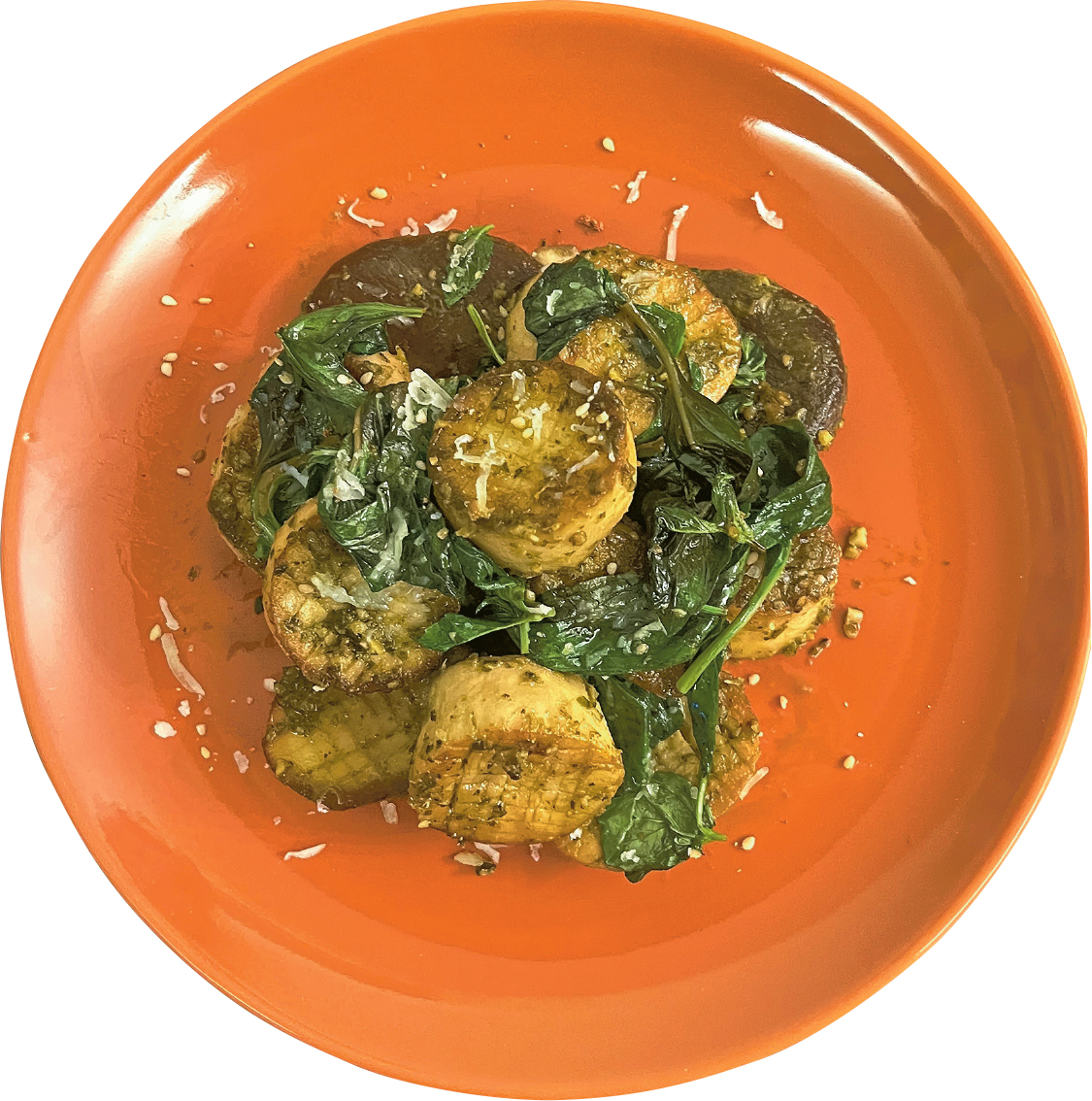 4.轉細火加入金不換和麻油拌炒,上碟後可加少許羊奶芝士碎和白芝麻
