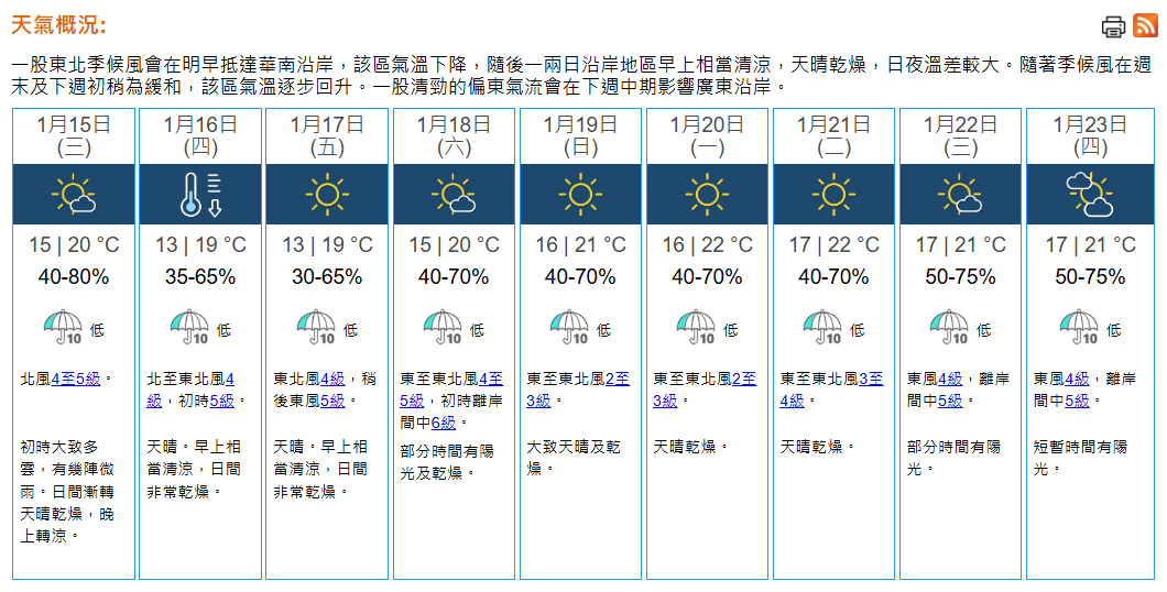 即時熱點 天氣|天文台:周三15°C-20°C 初時多雲有幾陣微雨 日間漸轉天晴乾燥 (22:15) 發佈於 1 年 前 2025 年 1 月 14 日 By 明報 一股偏東氣流正影響廣東沿岸。同時,一道雲帶覆蓋該區及南海北部。本港地區今晚(14日)及明日(15日)天氣預測:初時大致多雲,有幾陣微雨,明日日間漸轉天晴乾燥,明晚轉涼。氣溫介乎15°C至20°C。吹和緩至清勁東至東北風,明日轉吹偏北風。展望隨後一兩日天晴,日間非常乾燥,市區最低氣溫在13°C左右,新界再低幾度。周末期間早上仍然清涼。 此外,華南北部的氣壓正在上升,預料一股東北季候風會在明早抵達華南沿岸。(天文台) 相關文章:天文台天氣天氣速遞編輯推介 Up Next 滿月高掛 圖看各地2025年首輪滿月【多圖】 (20:16) 不要錯過 天氣|天文台:日間天色明朗最高19°C 明晚轉吹偏北風轉涼 (08:42) 繼續閱讀 贊助商 猜你喜歡 天氣|天文台:周日早上市區最低14℃ 部分地區寒冷 (17:55) 天氣|天文台:多雲有幾陣雨 今晚轉涼降至約17℃ (09:25) 【Emily】天文台「矚目天氣及氣候事件選舉」 投票有機會獲紀念品 天氣|天文台:周六多雲有雨 晚上轉涼氣溫17至21°C 下周日跌至最低14°C (21:22) 天氣|天文台:短暫時間有陽光 最高19°C (08:24) 天氣|天文台:周四多雲早晚有微雨 氣溫介乎17至20°C (20:57)