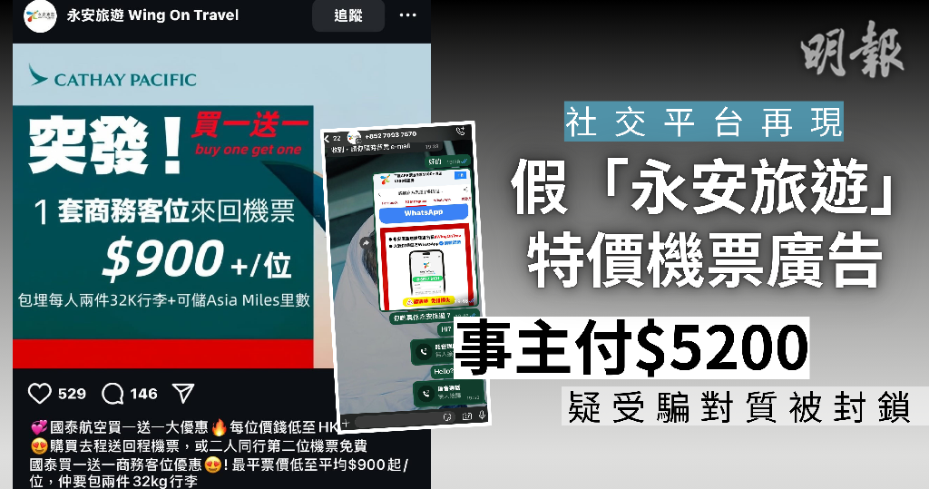 假「永安」特價機票廣告現社交平台 WhatsApp仿真度高 事主疑受騙$5200對質被封鎖對話 (14:10)