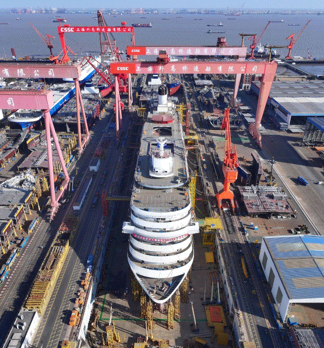今天(15日)上午,隨着郵輪大煙囪的吊裝到位,備受關注的第二艘國產大型郵輪H1509船(「愛達·花城號」)在中國船舶集團有限公司旗下上海外高橋造船有限公司2號船塢內實現了全船貫通(船體結構完成),全面轉入全船內裝工程、設備、系統調試下半場。