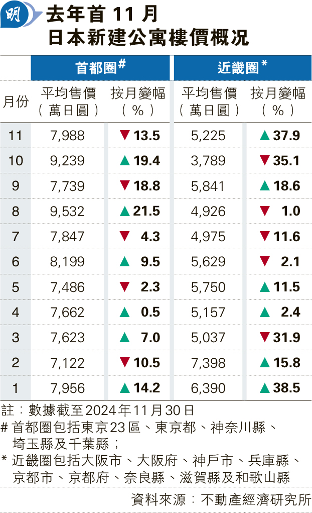近月日本一手公寓市場回軟,據日本不動產經濟研究所的數據,去年11月底,日本包括東京23區、東京都下、神奈川縣、埼玉縣及千葉縣的東京圈,也稱首都圈,一手公寓平均售價按月跌13.5%,按年僅跌3.2%,至7988萬日圓,其中東京23區平均售價按年跌15%,至近1.09億日圓,但市中心以外地區升勢持續,東京都下一手公寓平均售價按年升16.9%,至5915萬日圓。