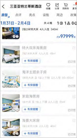 目前三亞大部分酒店已出現房型被訂光情况,海棠灣的地標亞特蘭蒂斯酒店在春節期間,以往1988元的低價房型早不見蹤影,特大雙牀海景房、海洋主題親子房等房型均已訂完。「三亞春節期間22萬一晚酒店被訂光」話題更衝上熱搜。