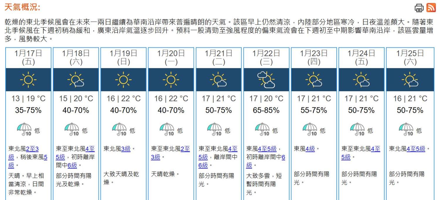 即時熱點 天氣|天文台:天晴乾燥最高19°C 周末及下周初仍然清涼 (08:17) 發佈於 9 個月 前 2025 年 1 月 17 日 By 明報 上午8時,天文台錄得氣溫13.2°C,相對濕度43%。 乾燥的東北季候風正為廣東帶來普遍晴朗的天氣。本港方面,今早(17日)市區氣溫下降至13°C或以下。由於天朗氣清,新界地區輻射冷卻尤其明顯,氣溫曾降至10°C或以下。 本港地區今日天晴。早上市區相當清涼,新界寒冷。日間非常乾燥,最高氣溫約19°C。吹輕微至和緩東北風,稍後轉吹清勁東風。展望周末及下周初早上仍然清涼,大致天晴及乾燥,日夜溫差較大。下周中期雲量增多,風勢較大。(天文台) 相關文章:天文台天氣天氣速遞編輯推介 Up Next 天氣|天文台:天晴乾燥 下周初早上清涼 (10:11) 不要錯過 天氣|天文台:周五最低13°C 日間非常乾燥 (21:08) 繼續閱讀 贊助商 猜你喜歡 天氣|天文台:天晴酷熱最高33°C 局部地區有驟雨 (08:14) 天氣|天文台:周三天晴酷熱 最高33°C (21:00) 水利部和中國氣象局發布山洪預警 (22:56) 天氣|天文台:大致多雲 最高氣溫32°C (08:13) 中國北方局部明起降溫10℃以上 青藏有暴雪 (19:35) 天文台發出一號戒備信號 (15:40)