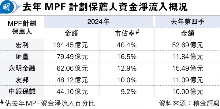 若按強積金計劃的保薦人計,宏利去年成為吸金最多的保薦人,去年共吸資194億元,按資金淨流入量計,其市佔率達40.4%居首(見表),單計去年第四季亦淨流入約53億元。信安去年淨流出約6.6億元,為走資最多的保薦人,去年第四季亦錄約2.8億元淨流出。