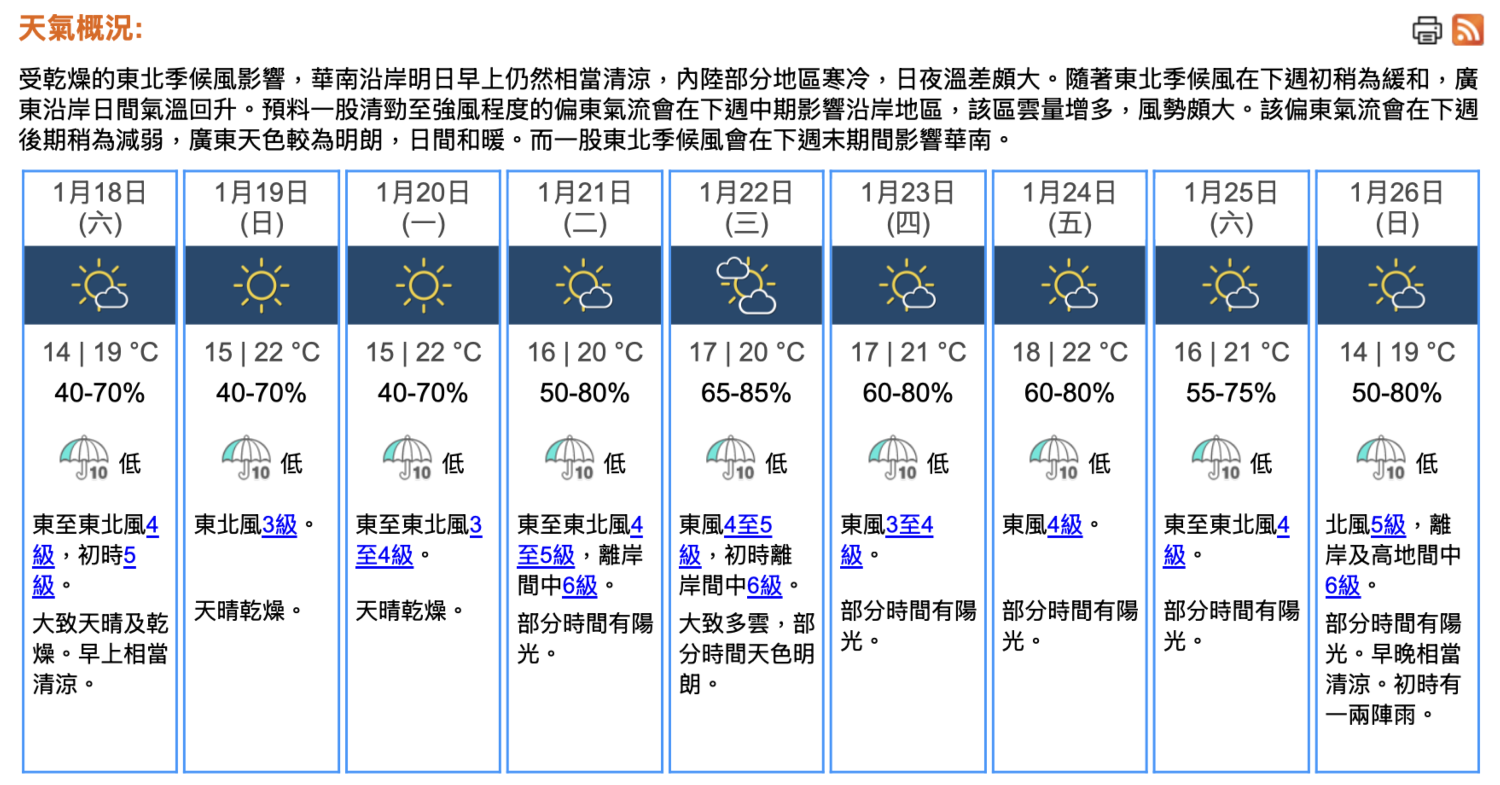 即時熱點 天氣|天文台:周六早上相當清涼 市區最低14°C (22:12) 發佈於 1 年 前 2025 年 1 月 17 日 By 明報 受乾燥的東北季候風影響,華南沿岸明日(18日)早上仍然相當清涼,內陸部分地區寒冷,日夜溫差頗大。本港今晚(17日)及明日預測大致天晴及乾燥。明早市區最低氣溫約14°C,新界再低幾度。日間最高氣溫約19°C。吹和緩東至東北風,初時風勢清勁。展望下周日(19日)及周一(20日)天晴乾燥,早上仍然清涼。下周二(21日)及周三(22日)雲量增多,風勢較大。(天文台) 相關文章:天文台天氣天氣速遞編輯推介 Up Next 特朗普1月20日就職 店舖放滿紀念品【圖輯】 (19:01) 不要錯過 天氣|天文台:天晴乾燥最高19°C 周末及下周初仍然清涼 (08:17) 繼續閱讀 贊助商 猜你喜歡 天氣|天文台:周日早上市區最低14℃ 部分地區寒冷 (17:55) 天氣|天文台:多雲有幾陣雨 今晚轉涼降至約17℃ (09:25) 【Emily】天文台「矚目天氣及氣候事件選舉」 投票有機會獲紀念品 天氣|天文台:周六多雲有雨 晚上轉涼氣溫17至21°C 下周日跌至最低14°C (21:22) 天氣|天文台:短暫時間有陽光 最高19°C (08:24) 天氣|天文台:周四多雲早晚有微雨 氣溫介乎17至20°C (20:57)
