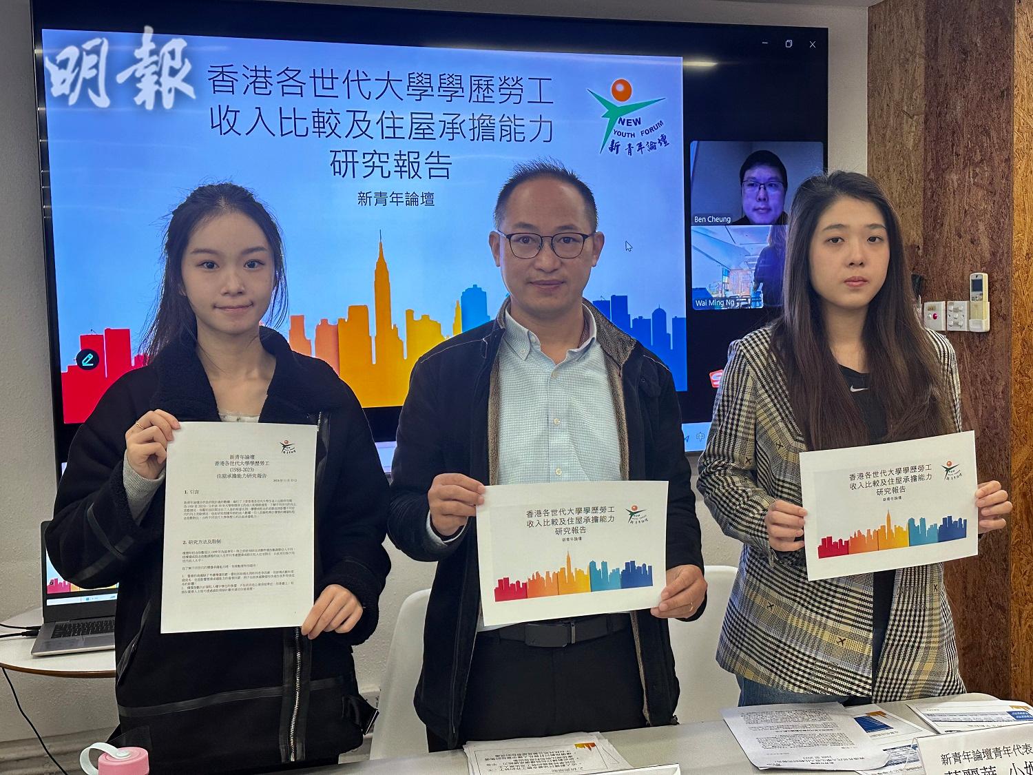 新青年論壇研究員張培然又稱,雖近年大學生的收入中位數及增長幅度均有所改善,但以新界一430呎單位的平均呎價除以大學生每月收入為例,第八代大學生需以其六成的月薪支付呎價、25歲至29歲的第七代大學生則需用近五成月薪支付呎價,兩者均遠超年長一代約兩成至三成的水平。張認為政府應在增加總體房屋供應的同時,嘗試發掘更多高增值產業,如電動車、航運等,讓社會有需求高薪聘請大學生,令他們有條件置業。