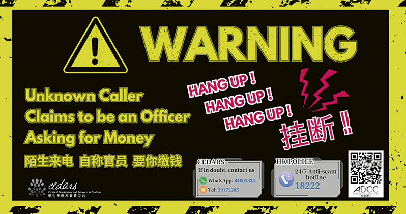 港大CEDARS在電郵提到,限期未完成問卷者,或被限制進入圖書館及共享學習空間。電郵附有以英文及簡體中文製作的「海報」,提供港大CEDARS的WhatsApp及電話,以及警方反詐騙協調中心查詢熱線。