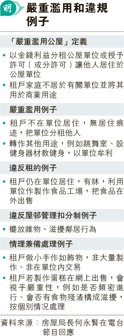 何在節目中解釋各類屬嚴重濫用、違反租約、違反屋邨管理扣分制的例子(見表)。她特別提及當局會情理兼備處理不同個案,並設上訴機制,多次強調會人性化處理租戶在單位製作物品和食品出售的情况。