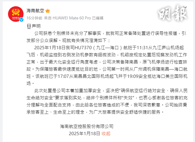 海南航空晚上發聲明,稱事件是「正常備降處置」HU7370航班起飛後,機組監控到右側引擎「參數有細微波動」,機組按規定處置後觀察引擎工作正常,出於最大化安全運行角度考慮,公司決策備降南昌,原飛機停場進行檢查排故。