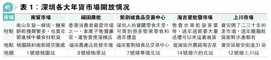 下星期三已經是大年初一,相信很多人都正忙於準備年貨,深圳許多批發市場、農批市場(見表1)和花卉市場(見表2),大都交通便利,地鐵可以直達,港人可以輕鬆享受一天的深圳之旅,並盡情掃貨。深圳不少花市及批發市場推出各式各樣的應節商品,從水果禮盒到海味、利市封、揮春及新年裝飾品,樣式繁多、價格相宜。