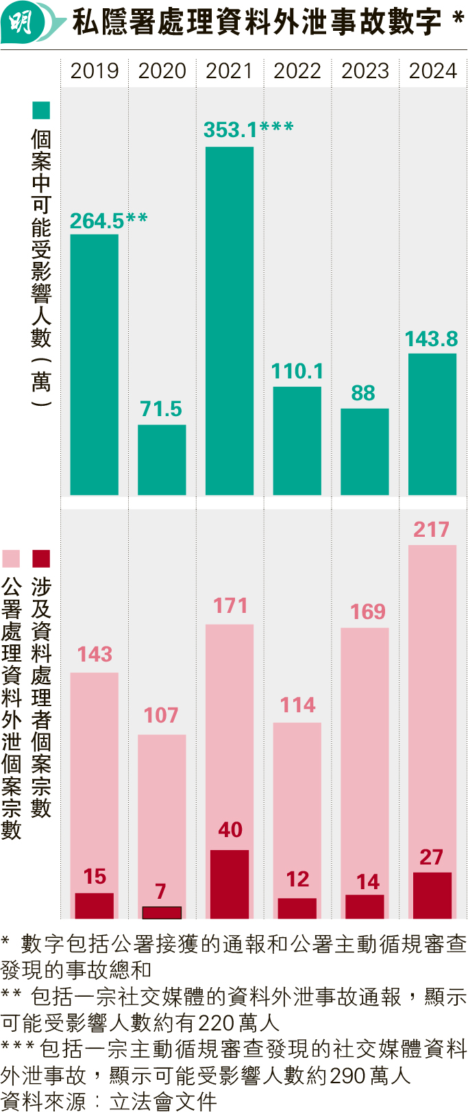 【明報專訊】本港去年有不同機構接連發生資料外泄事故,個人資料私隱專員公署共處理217宗有關事故,為6年新高;事故中有143.8萬人可能受影響,較前年多55.8萬人。政制及內地事務局長曾國衞表示,政府和公署對此十分關注,公署從多方面應對,包括研究修訂《個人資料(私隱)條例》,初步建議包括加重罰則;政府正研調整修例建議,例如是否可分階段實施。