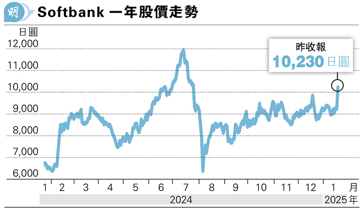 受合資企業成立及AI監管放寬刺激,軟銀周三在東京的股價急升一成,為自去年8月以來最大的單日升幅(見圖)。而甲骨文盤後交易急升逾7%,兩家公司市值合計增加逾400億美元。美股周三開市,人工智能概念股普遍走高,甲骨文上升逾一成,Nvidia升2%,標指向好,高開0.5%,道指亦高開152點。