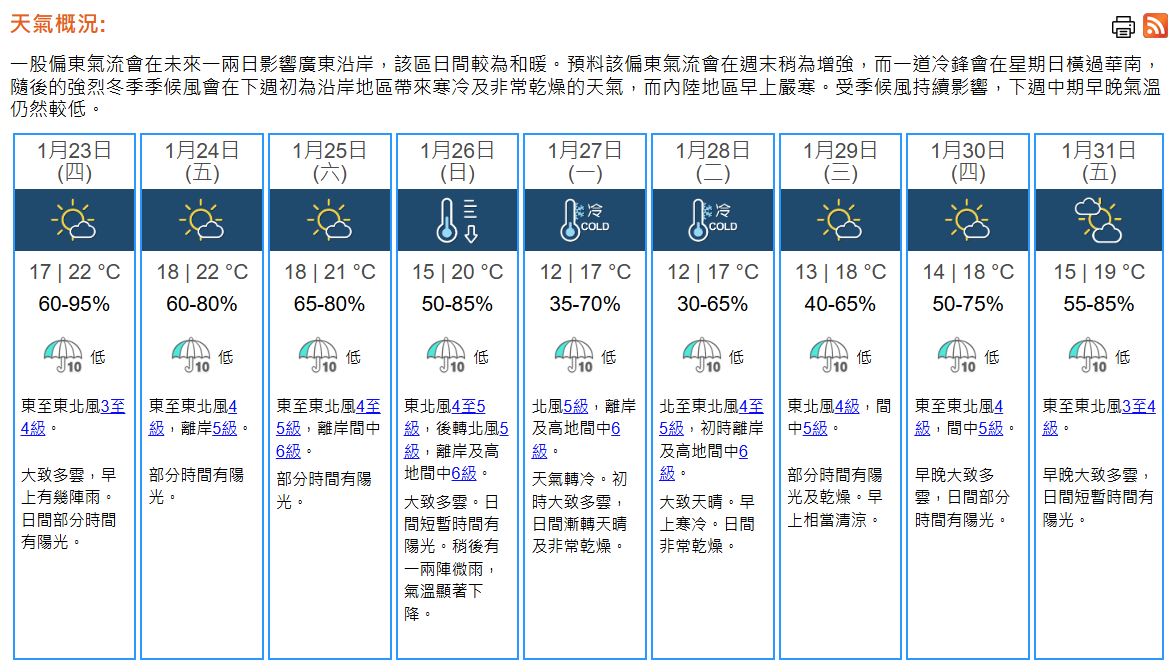 即時熱點 天氣|天文台:早上有雨 日間有陽光 最高22°C (08:47) 發佈於 9 個月 前 2025 年 1 月 23 日 By 明報 早上8時30分,天文台錄得氣溫18.3°C,相對濕度89%。一股偏東氣流正影響廣東沿岸。同時,一道雲帶覆蓋該區。本港方面,今早(23日)大部分地區錄得約5毫米雨量。 本港地區今日大致多雲。早上有幾陣雨。日間部分時間有陽光,最高氣溫約22°C。吹和緩東至東北風。 展望未來一兩日日間和暖。下周日(26日)至周一(27日)北風逐漸增強,下周一及年廿九(28日)天氣寒冷。年初一(29日)及年初二(30日)早晚氣溫仍然較低。(天文台) 相關文章:天文台天氣天氣速遞 Up Next 藍罐曲奇:留意到市場現仿冒品 話你知真藍罐曲奇特點 (14:50) 不要錯過 天氣|天文台:年廿八年廿九天氣轉冷非常乾燥 農曆年假早晚氣溫較低 (17:40) 繼續閱讀 贊助商 猜你喜歡 風神|天文台:下周一考慮直接發三號波 將評估需否發更高風球 下周二至四料低至20°C (16:53) 天氣|天文台:周五有驟雨 氣溫28至32°C (19:45) 天氣|天文台:周四局部地區有驟雨 日間炎熱最高32°C (21:00) 天氣|天文台:今早多處地區錄5毫米雨量 今日多雲有驟雨 下午部分地區雨勢較大有雷暴 (09:20) 天氣|酷熱警告生效 天文台:周末有一兩陣驟雨 (08:22) 天氣|天文台:周四天晴局部地區有驟雨 最高32°C (20:56)
