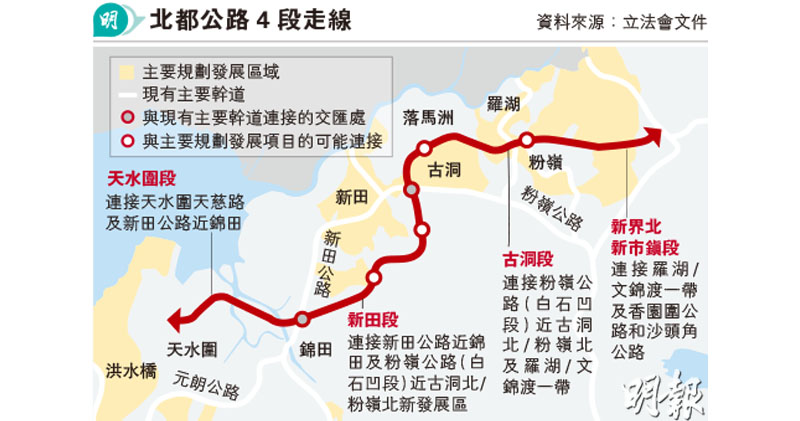 運物局補充,會以創新政策和創新技術推展北都公路項目,擬於今年內尋求立法會撥款開展勘查研究,目標配合新田科技城發展,於2036年或以前首先開通新田段。至於公路造價估算,當局尚未公布。
