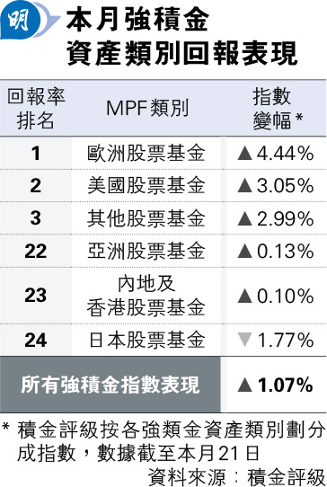 按各類MPF資產類別計,截至本月21日,歐洲及美國股票基金分別以4.44%和3.05%回報,排名回報率的首兩位。內地及香港股票基金則於月內略賺,以回報率0.1%排名第23位。另日本股票基金則虧損1.77%排第24位。