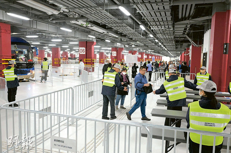 為配合演練,主場館旅遊巴上落客區昨晚設5條安檢通道,接待8輛旅遊巴共約200名觀眾,觀眾完成安檢後可直接經電梯進入場館。陳海麟稱,上落客區有56個旅遊巴停泊位,每天有半小時免費泊車,其後時租35元。陳強調園方會按活動需要和風險評估,彈性安排上落客,如安檢通道可「5變10,10變15」。