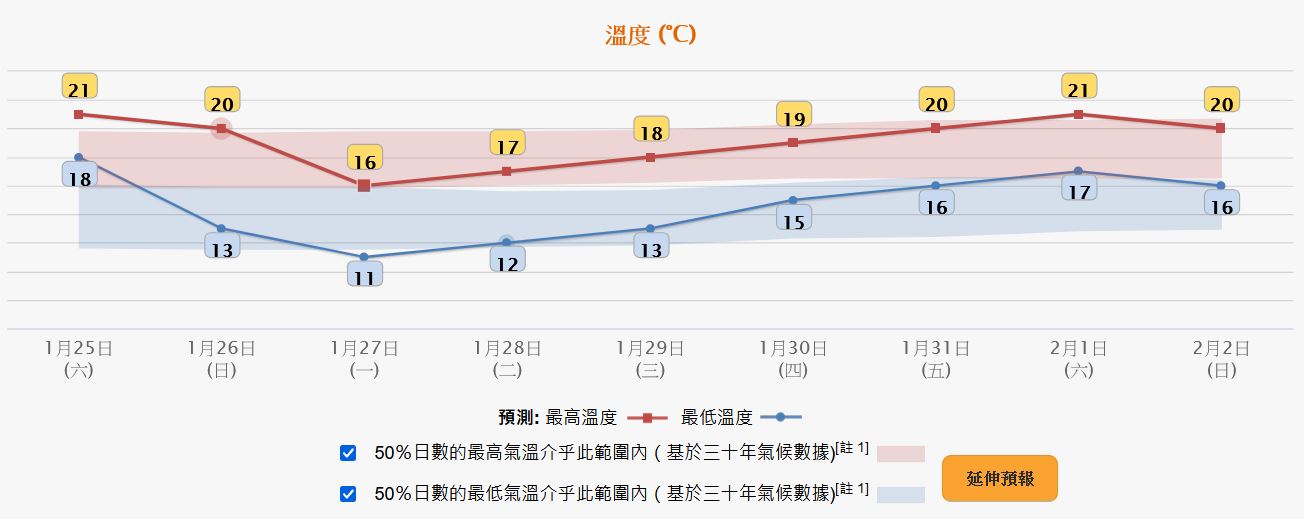 即時熱點 天氣|天文台:周六最高21°C 周日低見13°C (21:33) 發佈於 9 個月 前 2025 年 1 月 24 日 By 明報 天文台預料,周六(25日)早上最低氣溫約18°C,日間部分時間有陽光,最高氣溫約21°C,吹和緩至清勁東風,離岸及高地間中吹強風。展望周日(26日)北風逐漸增強,稍後顯著轉冷,低見13°C。周一(27日)及年廿九(28日)市區最低氣溫在11、12°C左右,漸轉天晴及非常乾燥。年初一(29日)早上新界仍然寒冷,隨後一兩日雲量逐漸增多及有一兩陣微雨。(天文台) 相關文章:天文台天氣天氣速遞編輯推介 Up Next 年花知多啲:桃花寓意「大展鴻圖」 牡丹象徵繁榮 (15:46) 不要錯過 短片:民眾返回加沙 搭帳篷暫住 (12:46) 繼續閱讀 贊助商 猜你喜歡 天文台上午8時40分錄18.4°C 今年入秋以來最低 (09:03) 天文台取消所有熱帶氣旋警告信號 (18:20) 天氣|天文台:周三有幾陣雨 市區最低19°C (20:57) 風神 | 緩慢趨向西南 海口3港停運 (00:34) 風神|教育局:幼稚園及部分特殊學校明日停課 (17:33) 天文台:下午5時20分直接發出三號強風信號 (12:06)