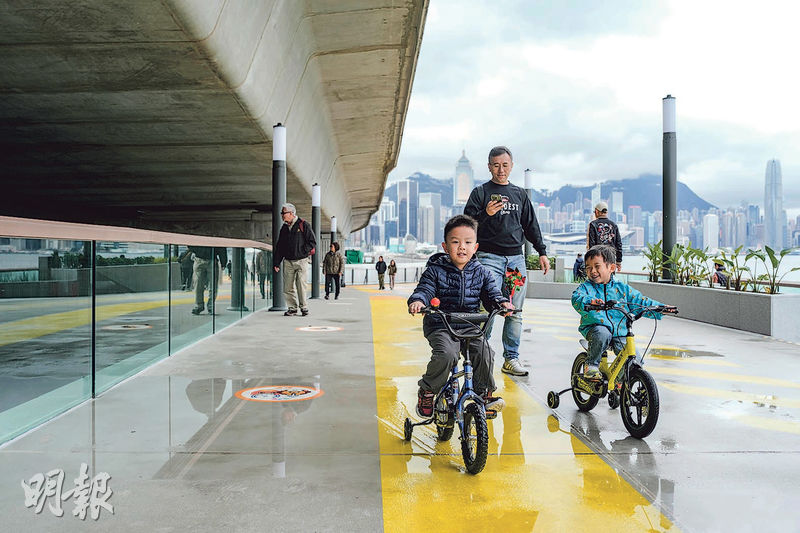【明報專訊】北角東區走廊下的東岸板道(西段)昨日早上6時起開放予公眾使用,連接東岸公園主題區及北角海濱花園,長約1.1公里,當中400米是經優化的北角海濱花園。東岸板道設有共享徑供市民作不同活動,例如步行、緩跑、踏單車等。板道的另一特色是在維港首次引入開合橋和轉盤橋。轉盤橋的開放時間為早上6時至晚上11時,東岸板道(西段)其餘部分將24小時開放。昨晨已有不少市民到板道參觀及拍攝維港風景,有市民放狗散步,也有單車友早上冒雨試用新單車徑。