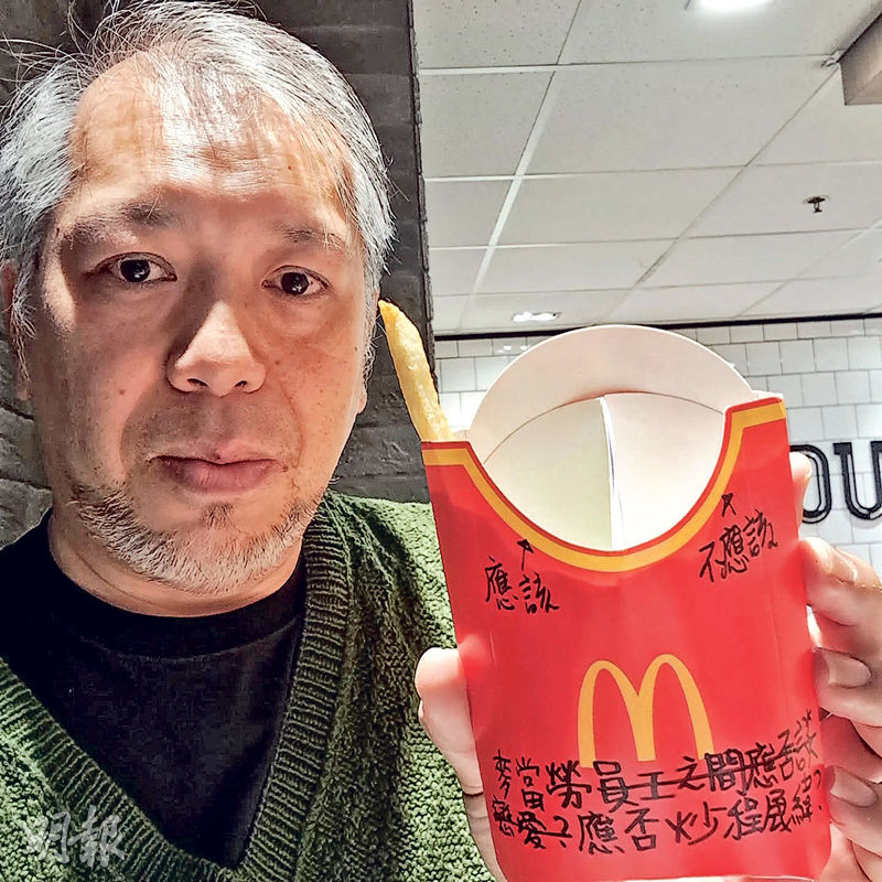 【明報專訊】關注勞工權益、近年從事不同散工的藝術家程展緯於麥當勞兼職半年,昨遭麥當勞以違反員工使用社交平台指引為由解僱。他認為勞工有表達權利,批評該決定令人失望,擔心令其他員工不敢討論公司政策。香港麥當勞發言人回覆本報稱,程受聘期內將公司內部營運及商業資訊於公開平台分享,違反僱員守則,曾勸喻及安排管理層會面,惟未改善,故決定終止僱傭關係。