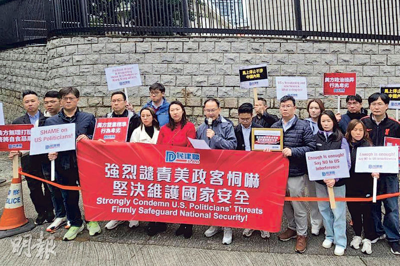 港聞 美議員推制裁港官名單 民建聯抗議 發佈於 9 個月 前 2025 年 1 月 27 日 By 明報 【明報專訊】美國有國會議員再次提出「香港制裁法案」,列出評估制裁名單,包括香港政府官員、法官和檢察官,中國外交部駐香港特別行政區特派員公署發言人在25日深夜表示強烈不滿和堅決反對,指美國個別反華政客無視香港良政善治,炮製惡法,形容這做法是公然踐踏法治精神,違背國際法原則和國際關係基本準則,暴露其無知偏見和虛偽雙標。民建聯副主席陳學鋒(前排持咪者)聯同多名立法會議員及區議員,昨午到美國駐港澳總領事館請願,指美國人員粗暴干涉香港事務,對此表示強烈不滿和譴責。 相關文章: Up Next 創辦人「80後」 畢業後開量化私募基金成龍頭 不要錯過 工傷病假未獲薪 裝修工一度瞓街 求助勞處追討逾年未果 處方:事主曾失聯 繼續閱讀 贊助商 猜你喜歡