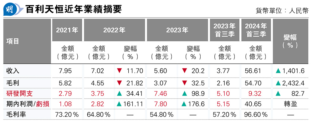 就是這個「由零到有」的故事,令百利天恒A股拾級而上。不過在百利天恒未收取上述那筆8億美元前,其創新藥物其實一直未有收入貢獻。也是說,於往績紀錄期百利天恒的收入,均來自於銷售超過100種規格的29種獲批藥品,即其原有的仿製藥及中成藥業務。不過有關業務近年受到「帶量採購」計劃影響,收入及毛利率持續下跌,2022年、2023年及去年首三季,百利天恒來自藥物銷售收入分別按年下跌11.7%、20.1%及13.1%;亦由於受計劃影響令藥物銷售價下跌,其藥品銷售毛利率由2021年的73.2%大幅下滑至去年首三季的41.6%。