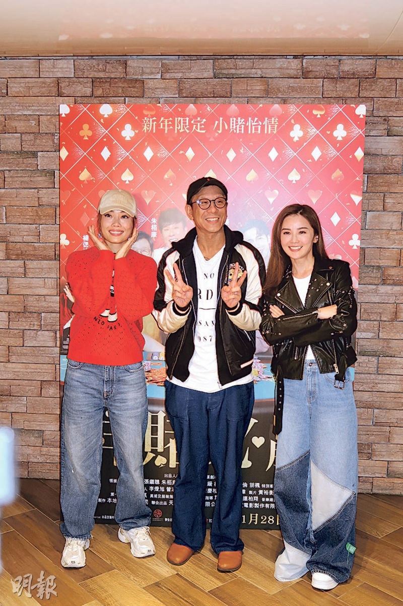 【明報專訊】賀歲片《祥賭必贏》導演羅耀輝率蔡卓妍(阿Sa)、張繼聰、謝安琪、朱栢康與吳家忻等到戲院謝票。容祖兒、蔡一智、張繼聰的子女也有捧場。曾大讚朱栢康靚仔的容祖兒,一見對方即開心甜笑,拉着阿Sa一起合照,夾在兩女中間的朱栢康露出尷尬笑容。有觀眾讚朱栢康時,阿Sa見到坐在觀眾席的容祖兒用手機狂影朱栢康,插口嘲諷好友說:「容祖兒都覺得朱栢康好靚仔呀!」