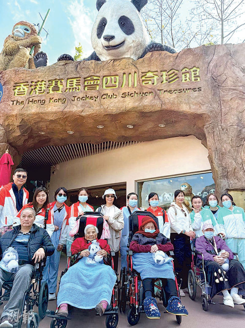 【明報專訊】農曆新年前不少人會跟家人團年。有安老院舍為幾名有長期或末期病患院友安排活動,日前邀請長者及其家人去海洋公園,幾家人一起觀賞大熊貓,外出提早共晉團年飯,冀為長者送上關懷。