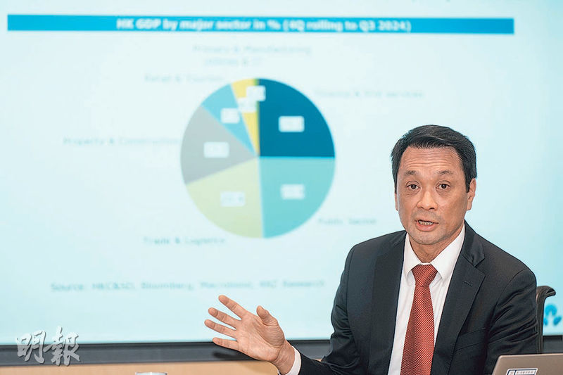 楊宇霆提到,現時金融服務業佔本地生產總值(GDP)約四分之一,他預料美國減息將令港樓交投好轉,另內地北水流入量加強的預期下,本港今年金融服務業的稅收將好轉,最快有望於2027/28財年達收支平衡。他估計本港今年GDP增長會為2.7%。