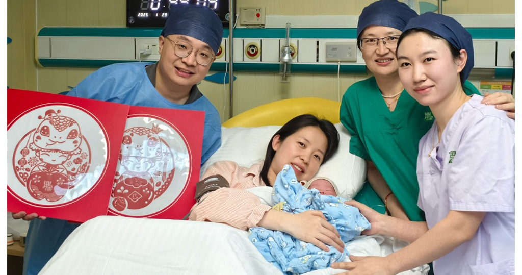 1時35分,上海市第一婦嬰保健院西院也有「蛇寶寶」出世,爸爸倪先生是一名羽毛球教練,他和妻子為寶寶準備一個有趣的小名「羽毛」。在醫護人員協助下,他們一家拍了首張合照。(澎湃新聞)