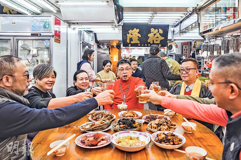 裕隆號1965年創立,開年飯傳統已承襲50多年。吳偉鴻昨晨7時拜神,10時許與數人一起炮製八餸一湯,包括寓意「發財好市」的髮菜蠔豉、「撈筍」的燜筍蝦等。近中午12時,13人終於開飯,因部分員工外遊,開席者較去年17人少。吳偉鴻說,由於近年銷情較差,因此入貨較保守,貨品零售價則變動不大。被問到會否減薪,他強調「慳自己都唔可以慳啲伙記,寧願自己使少啲」,過往按通脹加薪,不過明年可能會減少加薪幅度或維持薪酬水平,倘明年生意轉好,會提供少許補貼,希望員工會「同甘共苦」。