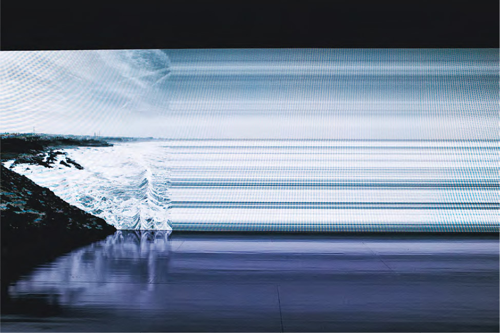 高谷史郎過往多次和坂本龍一創作三維裝置音樂,包括圍繞async的作品。async-immersion tokyo是高谷史郎自坂本龍一去世後的大型裝置創作,這次因應東京都現代美術館的展覽空間而重新編排,長形LED牆橫跨整個空間,更大幅地投影出坂本龍一紐約工作室中的各種物件圖像,如鋼琴、盆栽,或者巨浪拍岸、白雲流動、蓊鬱樹林等等,影像從左側或右側邊緣開始變化,由定鏡畫面分解成細長的水平線,迴環往復,又過渡至另一個影像,真的感受到時間的延遲與累積,呈現坂本龍一對非同步、反線性時間觀的思考,印象深刻。