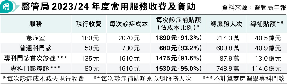 醫管局2023/24年度年報數據顯示,急症室、普通科和專科門診由政府補貼逾九成開支(見表),以急症室為例,現行收費為180元,每次診症成本為2070元,意味其中1890元成本由政府補貼,而以該年度服務214.3萬人次計算,即政府共補貼40.5億元。數據顯示,57.8%急症室診症分類為最不緊急的第四和第五類,惟年報未有按病人分流類別劃分診症成本。