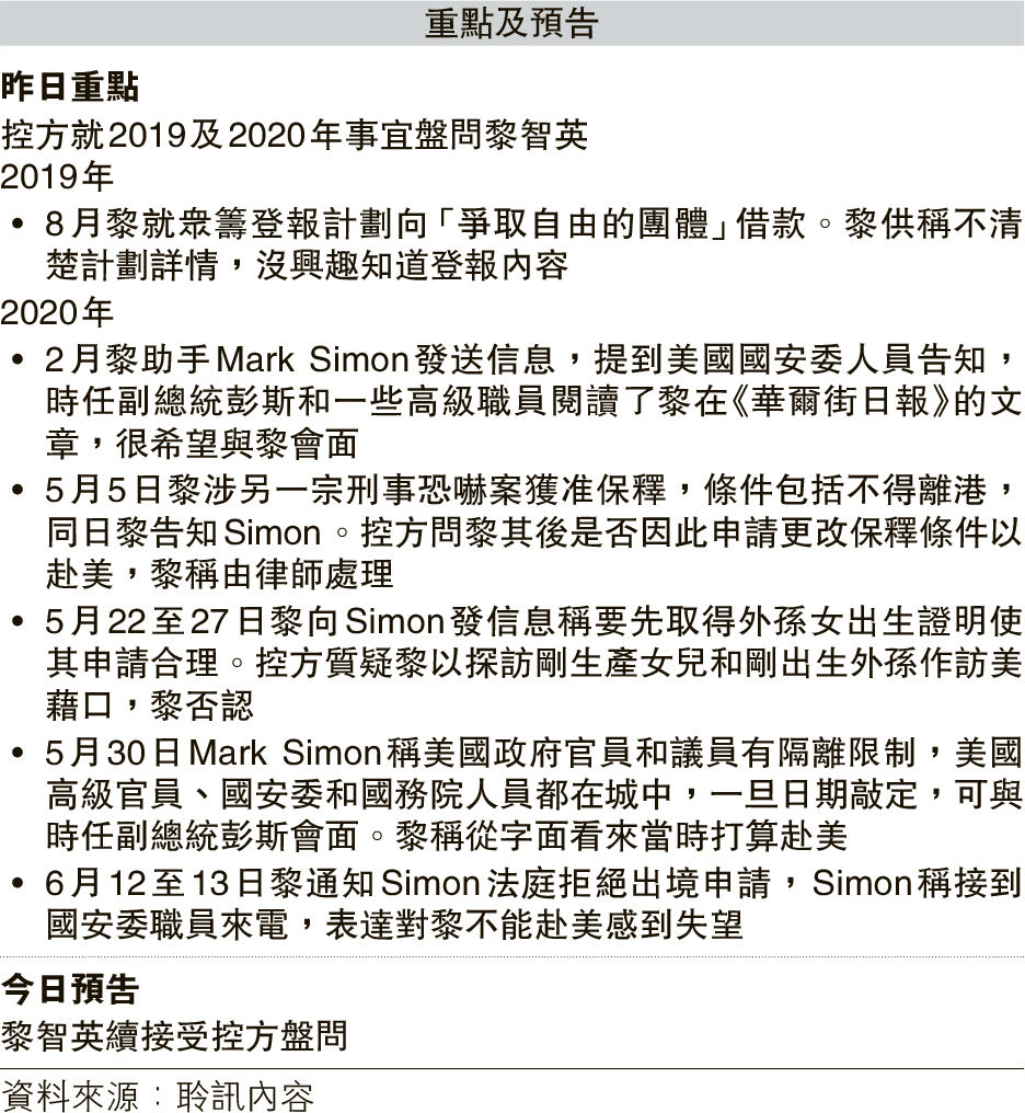 控方續展示6月黎從秘書轉寄Simon他的訪美行程表,顯示黎打算6月下旬啟程,7月中旬回程。控方稱黎當時另涉一宗刑事恐嚇案,保釋條件包括不得離港,正因黎有意訪美,後來才透過法律代表到高院申請更改保釋條件,最終申請在6月被拒。黎解釋保釋事宜由律師處理,又說他是希望到美國探望剛生產女兒和剛出生外孫女。