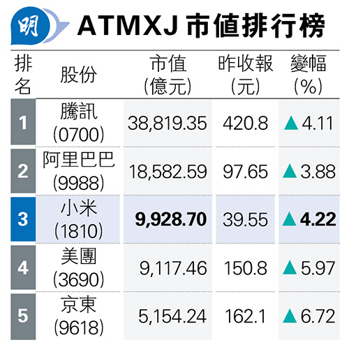 【明報專訊】受惠於內地數碼產品舊換新補貼,加上大摩唱好小米(1810)今年業務表現繼續強勁,摩通亦料集團將受惠於AI大模型DeepSeek R1的發展,小米股價節節上升,昨日曾升穿40元關口,高見40.1元,市值突破1萬億元;收市仍升4.22%至39.55元,市值達9928.7億元,超越美團(3690)市值。