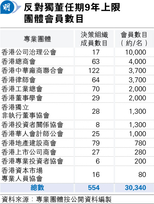 【明報專訊】港交所(0388)在加強獨立非執行董事監管工作或遇暗湧。獨董任職6家上市公司上限及9年任期上限的新規定在今年7月1日生效前,據悉有專業團體正醞釀為獨董最長任職9年修訂翻盤。有團體就諮詢收回意見進行分析,認為港交所建議收到贊成意見數量雖剛過半數,但大多來自機構及個人投資者,而提反對意見的專業團體,涉及會員數目超越3萬(見表),上市公司亦來自中外不同背景。有意見指儘管贊成、反對者「含金量」有別,但是在諮詢時,當局將機構和團體回應與個人回應一樣視作一份計算,難免引起爭議。