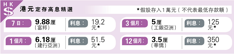 經濟 港元定存一年期年息3.5厘 發佈於 1 年 前 2025 年 2 月 5 日 By 明報 【明報專訊】新春長假後,銀行港元定存息率變化不大,一年定存優惠維持3.5厘。 (請看附圖) 相關文章: Up Next 姜靜:貿易戰下 匯市波動增 不要錯過 張兆聰:看好港股 港交所可博 繼續閱讀 贊助商 猜你喜歡